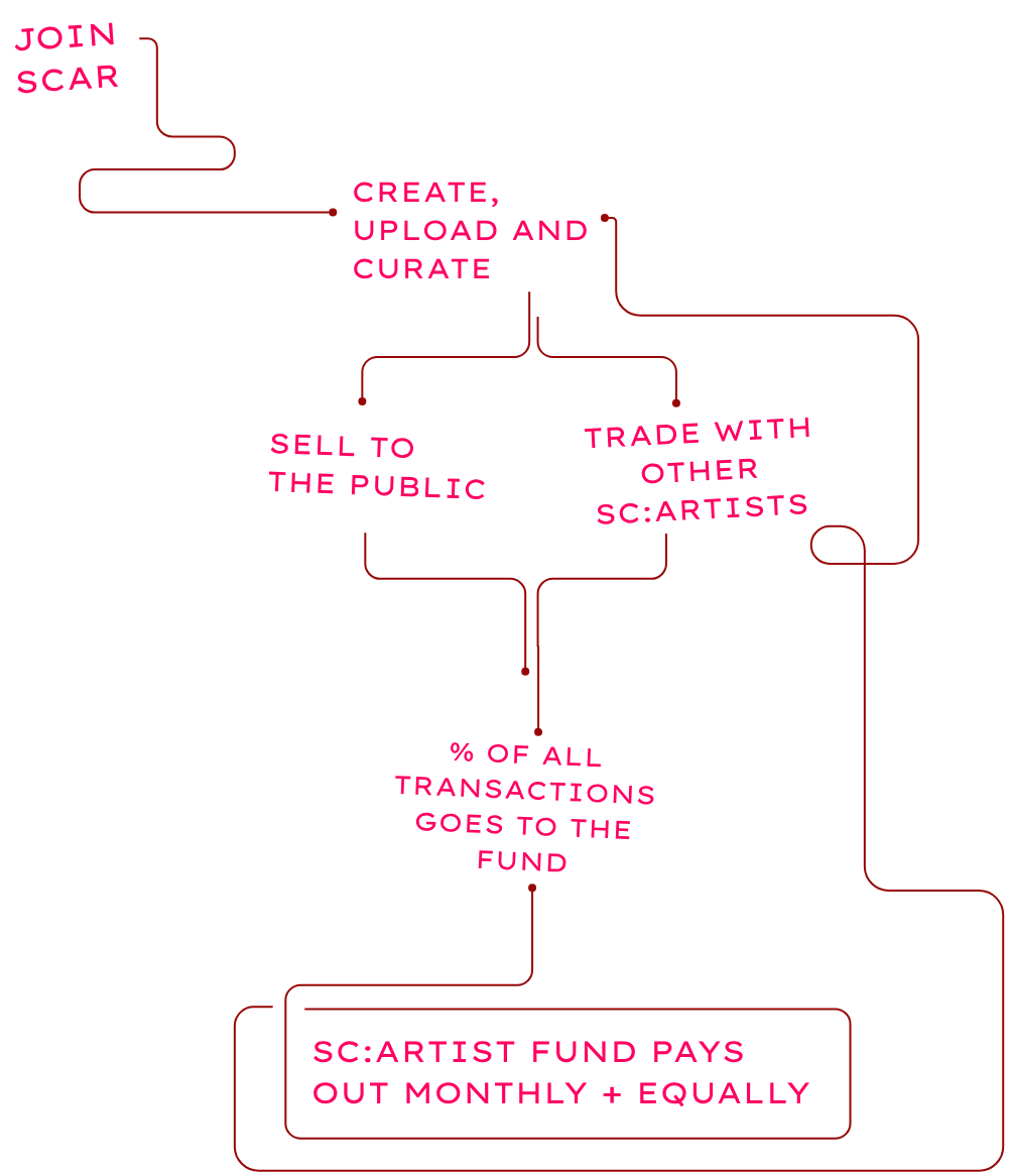 Scar is a social platform focused around the trading and selling of art.Most importantly, the platform's revenue is redistributed regularly and equally to all of our sc:artists - creating a financially self-sustainable model that allows you to work as an artist and receive regular payments. This leans into solidarity and away from competition.